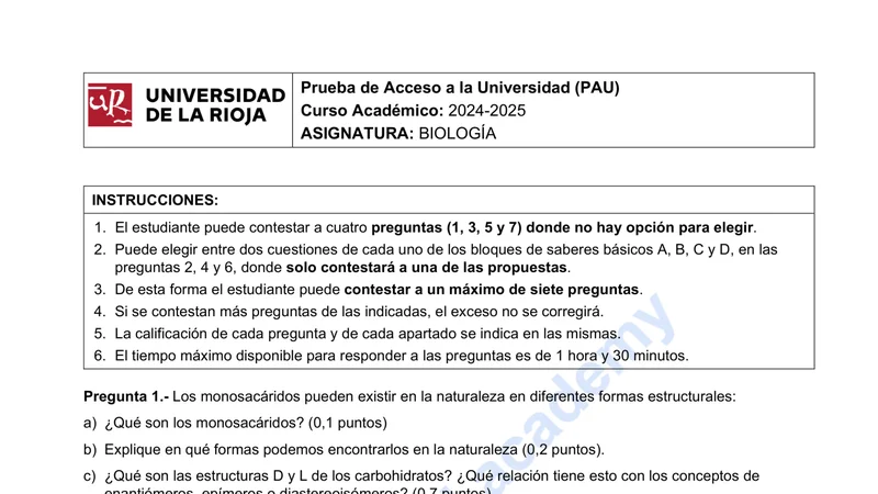 Reservar clase gratis →Examen de Biología selectividad La Rioja (Ordinaria 2025)