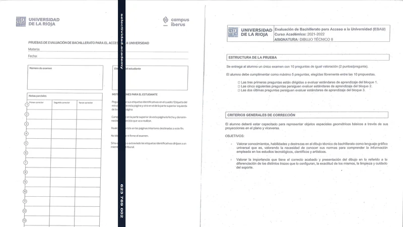 Enunciado oficial del examen de Dibujo Técnico II de la convocatoria extraordinaria de 2022 de la EBAU/PAU de La Rioja. PDF de 2.6 MB. Descarga gratuita y sin registro. ¿Preparando la selectividad? Calcula tu nota estimada o consulta la guía completa de selectividad 2026. Encuentra todos los exámenes de Dibujo Técnico II en La Rioja o explora las 17 comunidades autónomas.