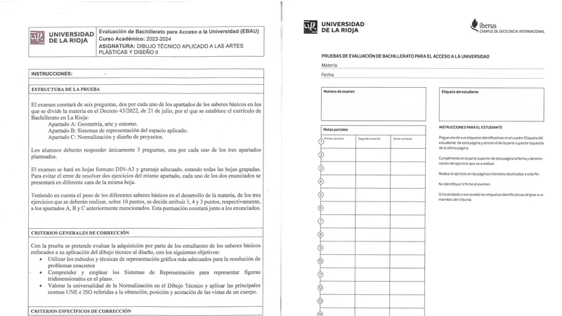 Enunciado oficial del examen de Dibujo Técnico II de la convocatoria ordinaria de 2024 de la EBAU/PAU de La Rioja. PDF de 3.2 MB. Descarga gratuita y sin registro. ¿Preparando la selectividad? Calcula tu nota estimada o consulta la guía completa de selectividad 2026. Encuentra todos los exámenes de Dibujo Técnico II en La Rioja o explora las 17 comunidades autónomas.