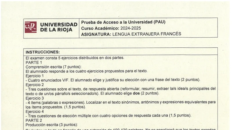 Examen PAU Francés selectividad La Rioja — Ordinaria 2025