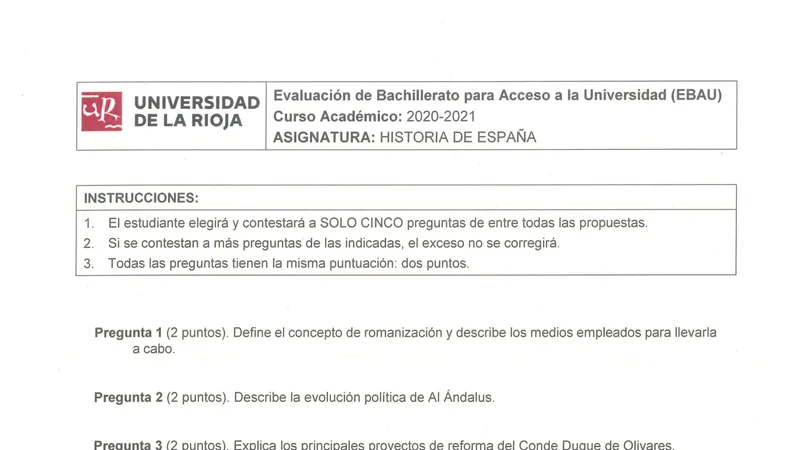 Examen PAU Historia de España selectividad La Rioja — Extraordinaria 2021