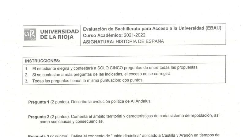 Examen PAU Historia de España selectividad La Rioja — Extraordinaria 2022