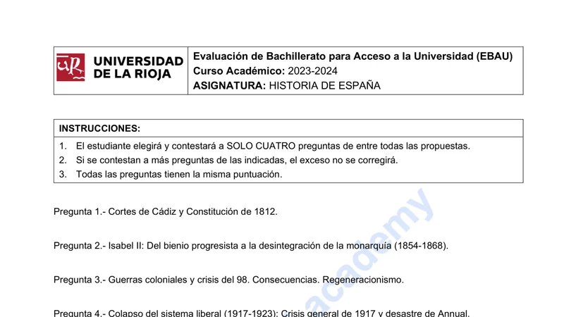 Examen PAU Historia de España selectividad La Rioja — Ordinaria 2024