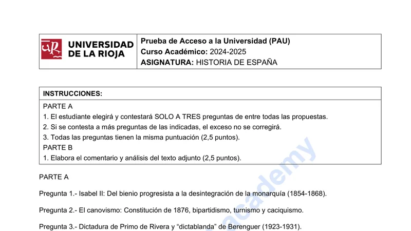 Examen PAU Historia de España selectividad La Rioja — Ordinaria 2025