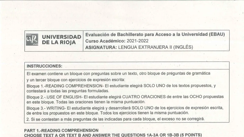 Enunciado oficial del examen de Inglés de la convocatoria extraordinaria de 2022 de la EBAU/PAU de La Rioja. PDF de 2.9 MB. Descarga gratuita y sin registro. ¿Preparando la selectividad? Calcula tu nota estimada o consulta la guía completa de selectividad 2026. Encuentra todos los exámenes de Inglés en La Rioja o explora las 17 comunidades autónomas.