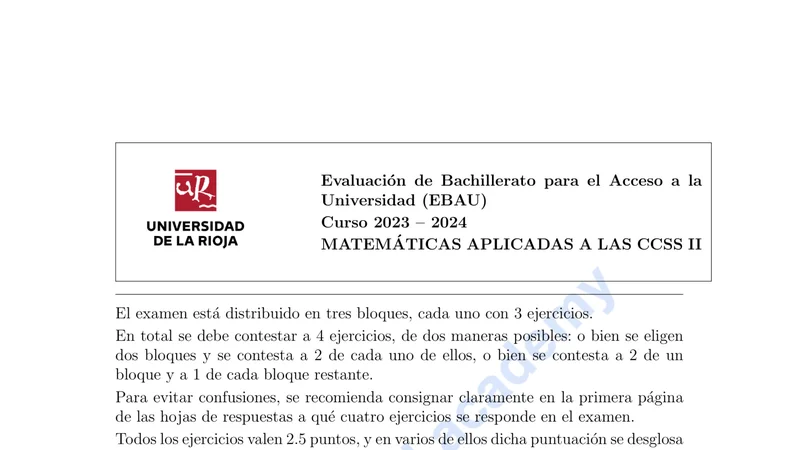 Reservar clase gratis →Examen de Matemáticas CCSS selectividad La Rioja (Ordinaria 2024)