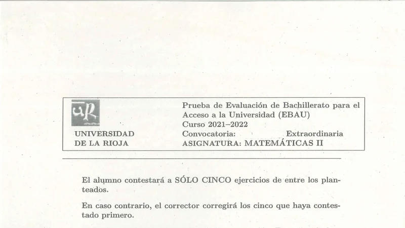Enunciado oficial del examen de Matemáticas II de la convocatoria extraordinaria de 2022 de la EBAU/PAU de La Rioja. PDF de 1.9 MB. Descarga gratuita y sin registro. ¿Preparando la selectividad? Calcula tu nota estimada o consulta la guía completa de selectividad 2026. Encuentra todos los exámenes de Matemáticas II en La Rioja o explora las 17 comunidades autónomas.