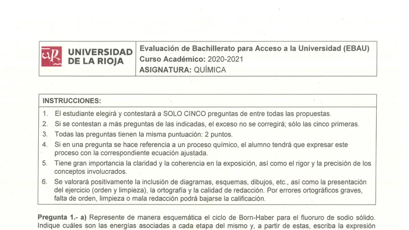 Examen PAU Química selectividad La Rioja — Extraordinaria 2021