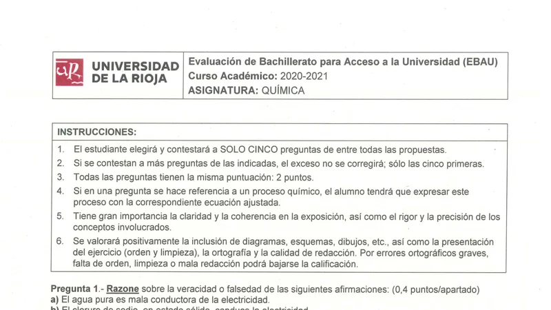 Enunciado oficial del examen de Química de la convocatoria ordinaria de 2021 de la EBAU/PAU de La Rioja. PDF de 1.3 MB. Descarga gratuita y sin registro. ¿Preparando la selectividad? Calcula tu nota estimada o consulta la guía completa de selectividad 2026. Encuentra todos los exámenes de Química en La Rioja o explora las 17 comunidades autónomas.