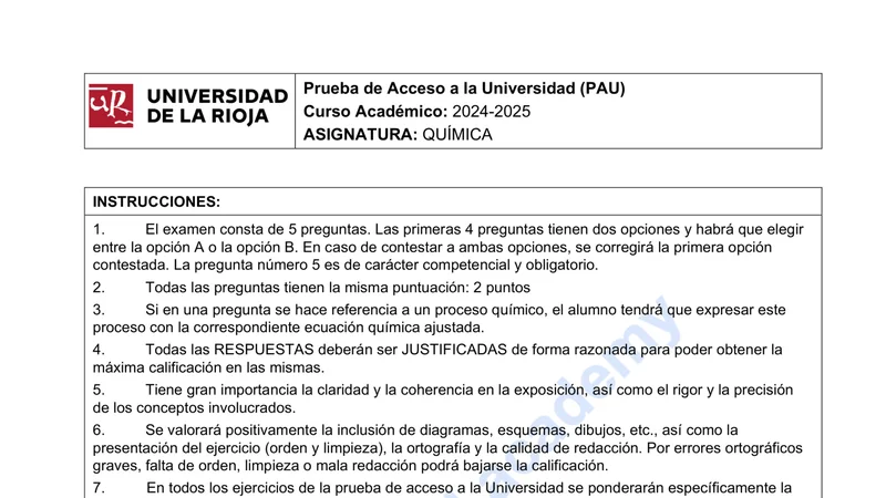 Reservar clase gratis →Examen de Química selectividad La Rioja (Ordinaria 2025)