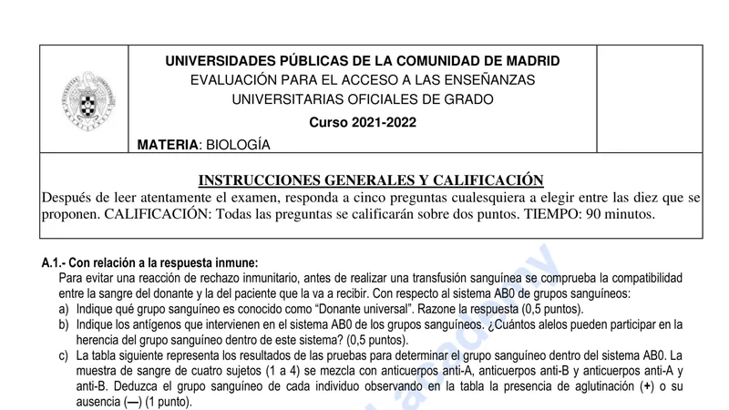 Reservar clase gratis →Examen de Biología selectividad Madrid (Extraordinaria 2022)