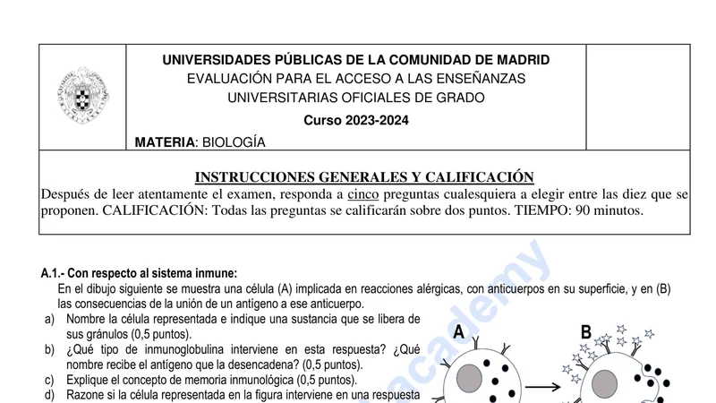 Reservar clase gratis →Examen de Biología selectividad Madrid (Extraordinaria 2024)