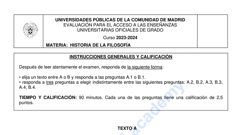 Examen de Historia de la Filosofía selectividad Comunidad de MadridOrdinaria 2024