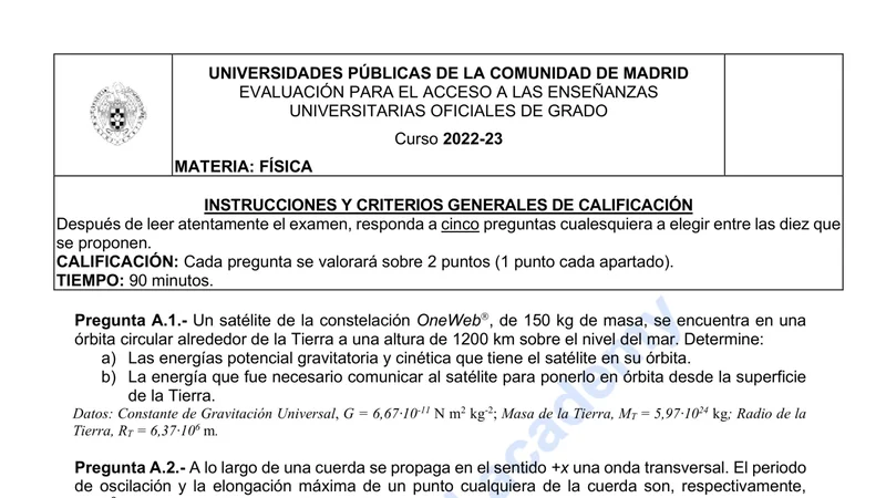 Examen de Física selectividad Madrid — Ordinaria 2023