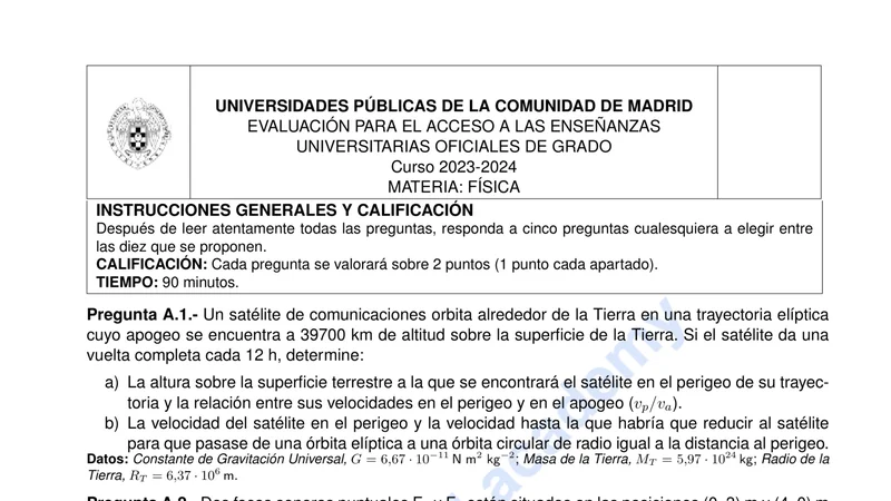 Enunciado oficial del examen de Física de la convocatoria extraordinaria de 2024 de la EvAU/PAU de Madrid. PDF de 0.3 MB. Descarga gratuita y sin registro. ¿Preparando la selectividad? Calcula tu nota estimada o consulta la guía completa de selectividad 2026. Encuentra todos los exámenes de Física en Madrid o explora las 17 comunidades autónomas.