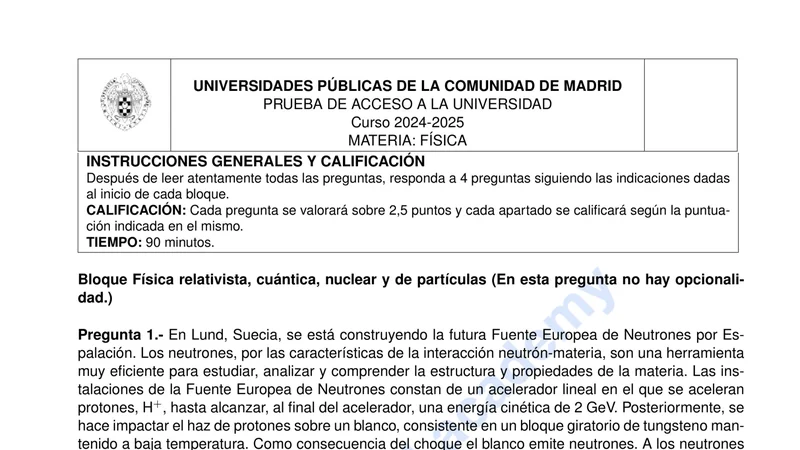 Enunciado oficial del examen de Física de la convocatoria extraordinaria de 2025 de la EvAU/PAU de Madrid. PDF de 0.3 MB. Descarga gratuita y sin registro. ¿Preparando la selectividad? Calcula tu nota estimada o consulta la guía completa de selectividad 2026. Encuentra todos los exámenes de Física en Madrid o explora las 17 comunidades autónomas.