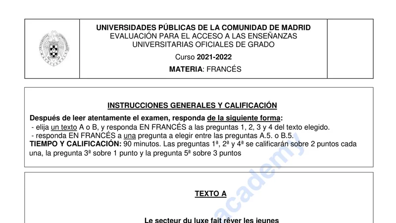 Reservar clase gratis →Examen de Francés selectividad Madrid (Ordinaria 2022)