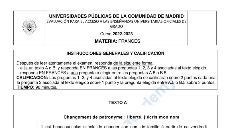 Reservar clase gratis →Examen de Francés selectividad Madrid (Ordinaria 2023)
