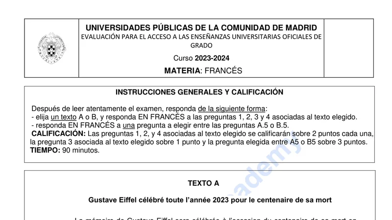 Examen PAU Francés selectividad Madrid — Extraordinaria 2024
