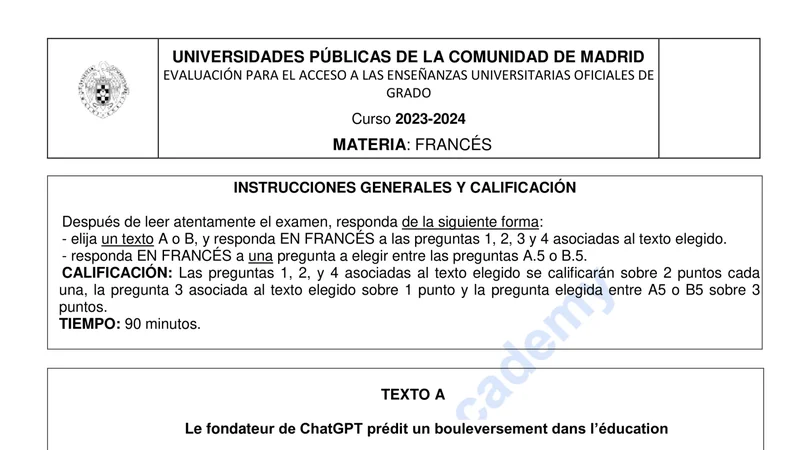 Examen PAU Francés selectividad Madrid — Ordinaria 2024