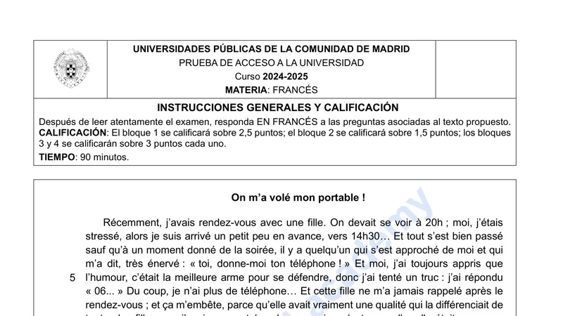 Examen PAU Francés selectividad Madrid — Ordinaria 2025