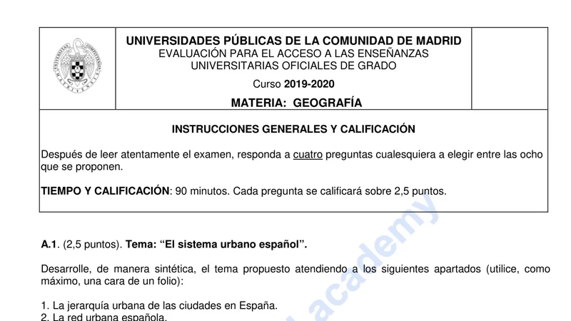Reservar clase gratis →Examen de Geografía selectividad Madrid (Extraordinaria 2020)