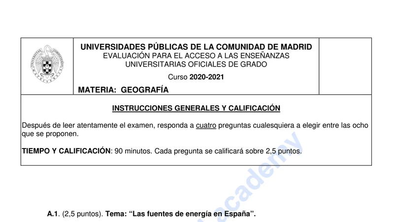 Reservar clase gratis →Examen de Geografía selectividad Madrid (Ordinaria 2021)