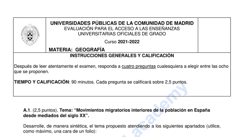 Reservar clase gratis →Examen de Geografía selectividad Madrid (Extraordinaria 2022)