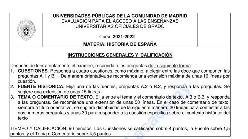 Reservar clase gratis →Examen de Historia de España selectividad Madrid (Extraordinaria 2022)