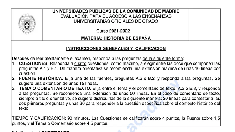 Examen PAU Historia de España selectividad Madrid — Ordinaria 2022