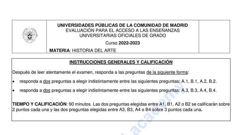 Enunciado oficial del examen de Historia del Arte de la convocatoria extraordinaria de 2023 de la EvAU/PAU de Madrid. PDF de 0.2 MB. Descarga gratuita y sin registro. ¿Preparando la selectividad? Calcula tu nota estimada o consulta la guía completa de selectividad 2026. Encuentra todos los exámenes de Historia del Arte en Madrid o explora las 17 comunidades autónomas.