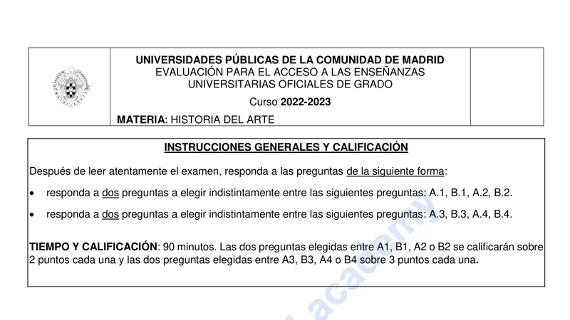 Enunciado oficial del examen de Historia del Arte de la convocatoria ordinaria de 2023 de la EvAU/PAU de Madrid. PDF de 0.2 MB. Descarga gratuita y sin registro. ¿Preparando la selectividad? Calcula tu nota estimada o consulta la guía completa de selectividad 2026. Encuentra todos los exámenes de Historia del Arte en Madrid o explora las 17 comunidades autónomas.