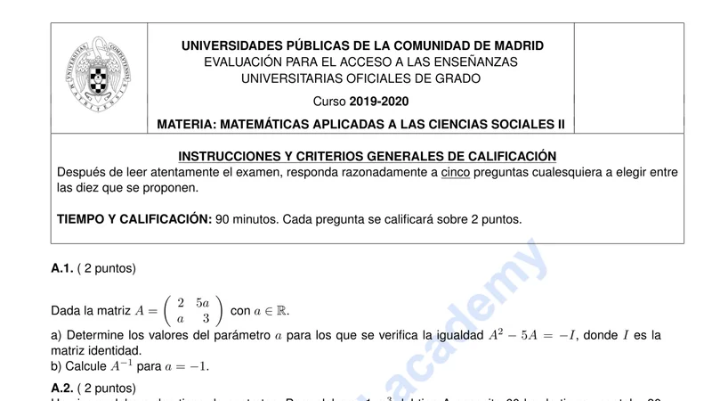 Examen PAU Matemáticas CCSS selectividad Madrid — Extraordinaria 2020