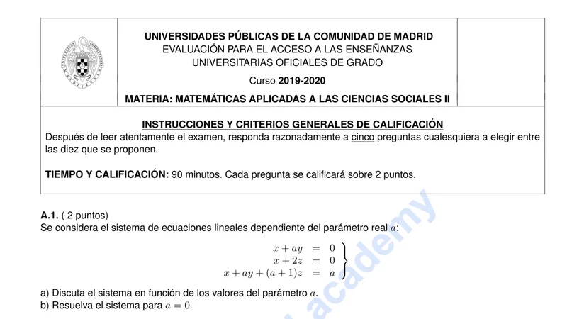 Reservar clase gratis →Examen de Matemáticas CCSS selectividad Madrid (Ordinaria 2020)
