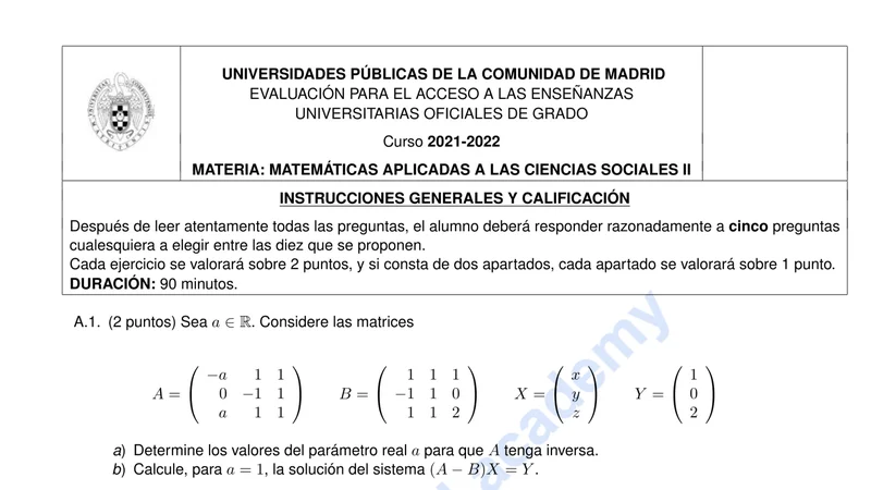 Reservar clase gratis →Examen de Matemáticas CCSS selectividad Madrid (Extraordinaria 2022)