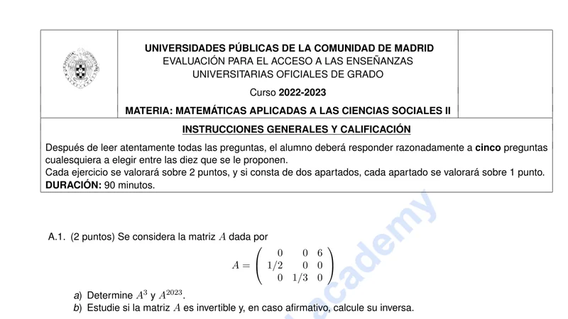 Reservar clase gratis →Examen de Matemáticas CCSS selectividad Madrid (Extraordinaria 2023)