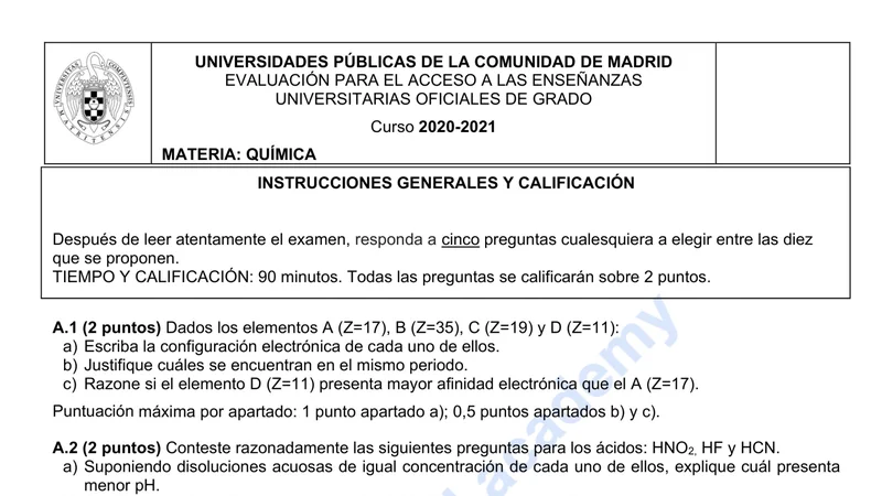 Reservar clase gratis →Examen de Química selectividad Madrid (Ordinaria 2021)