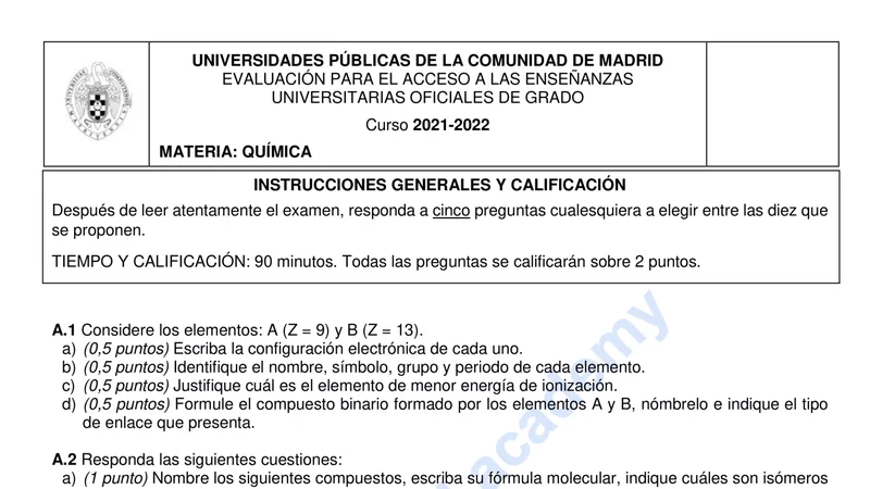 Reservar clase gratis →Examen de Química selectividad Madrid (Ordinaria 2022)