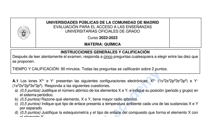 Reservar clase gratis →Examen de Química selectividad Madrid (Ordinaria 2023)