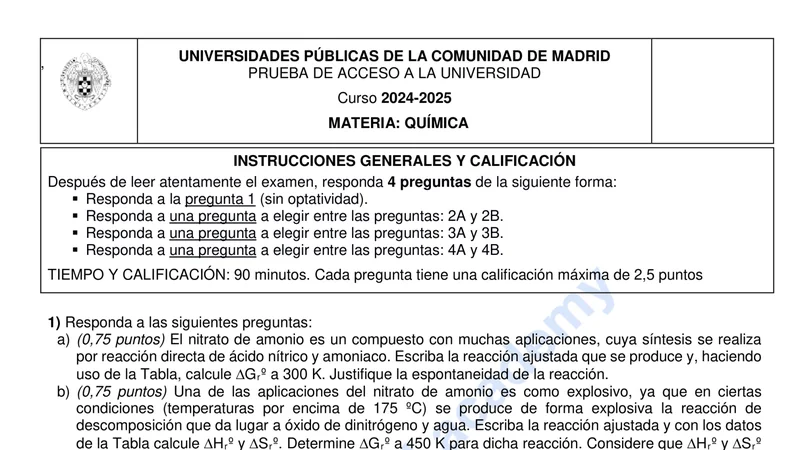 Reservar clase gratis →Examen de Química selectividad Madrid (Ordinaria 2025)