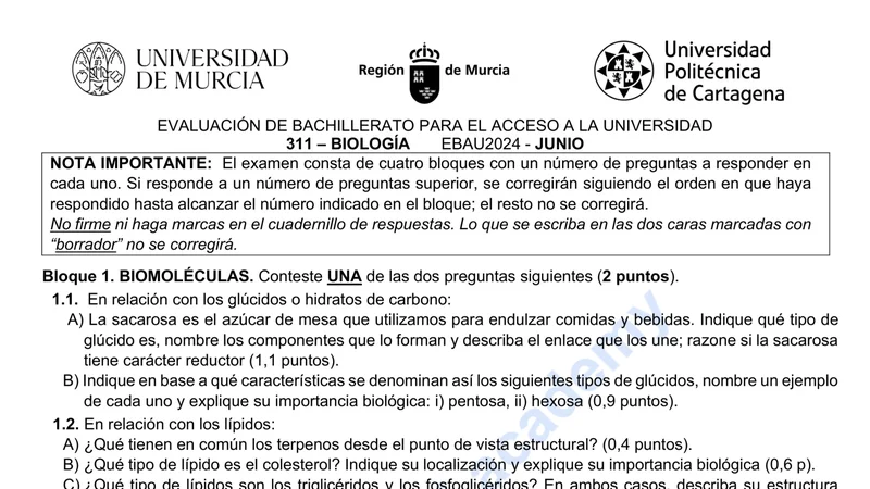 Examen PAU Biología selectividad Murcia — Ordinaria 2024
