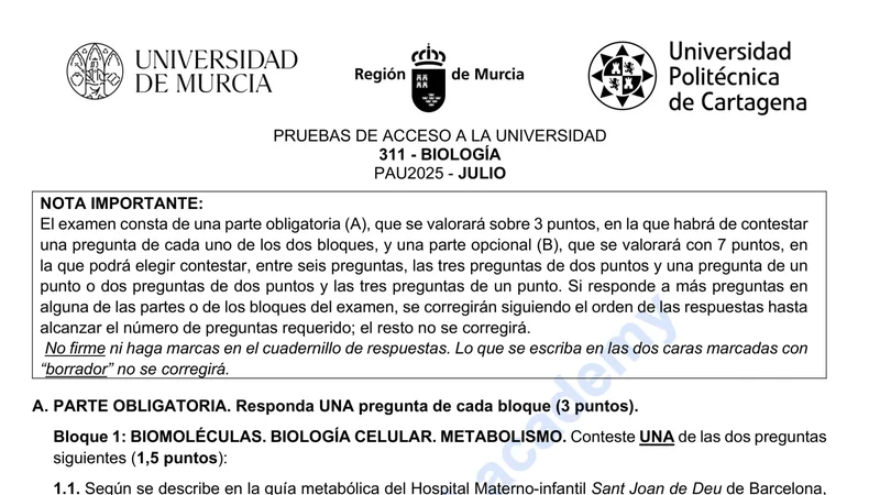 Reservar clase gratis →Examen de Biología selectividad Murcia (Extraordinaria 2025)