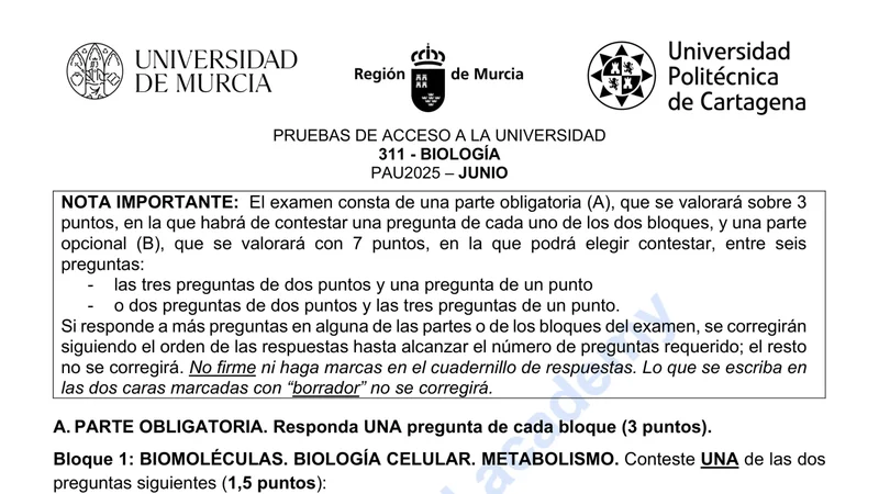 Examen PAU Biología selectividad Murcia — Ordinaria 2025