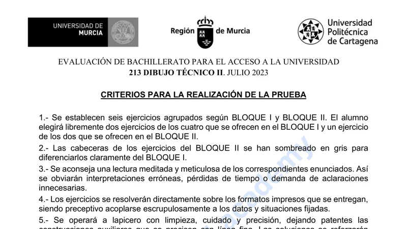Enunciado oficial del examen de Dibujo Técnico II de la convocatoria ordinaria de 2023 de la EBAU/PAU de Región de Murcia. PDF de 0.5 MB. Descarga gratuita y sin registro. ¿Preparando la selectividad? Calcula tu nota estimada o consulta la guía completa de selectividad 2026. Encuentra todos los exámenes de Dibujo Técnico II en Región de Murcia o explora las 17 comunidades autónomas.