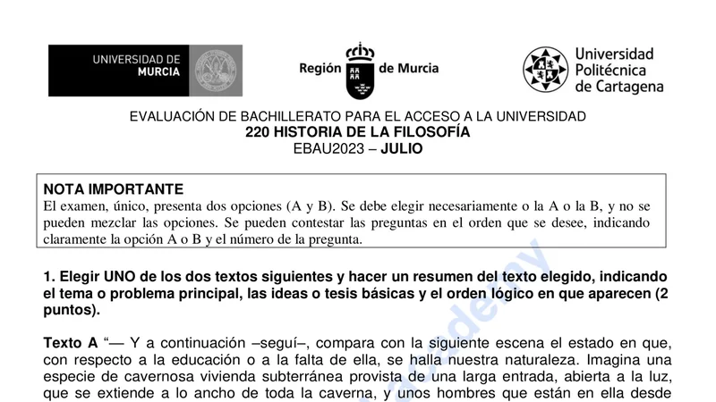 Examen de Historia de la Filosofía selectividad Región de MurciaExtraordinaria 2023