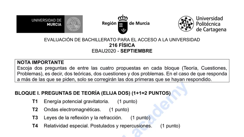 Examen PAU Física selectividad Murcia — Extraordinaria 2020