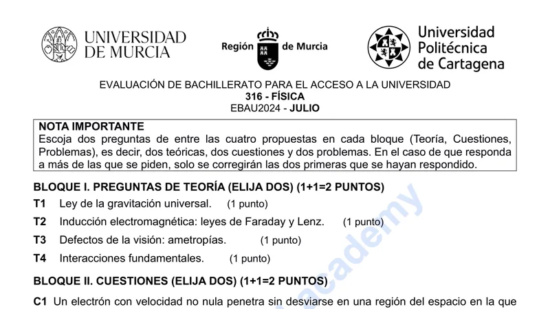 Examen PAU Física selectividad Murcia — Extraordinaria 2024