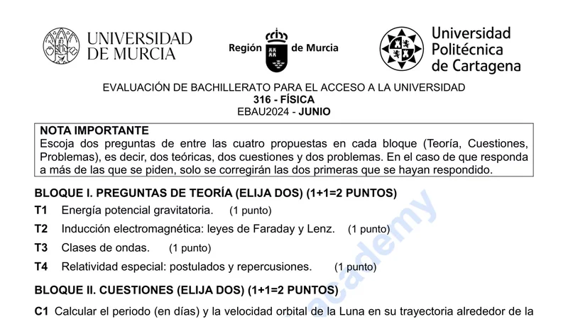 Examen PAU Física selectividad Murcia — Ordinaria 2024