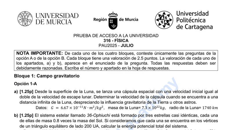 Examen PAU Física selectividad Murcia — Extraordinaria 2025