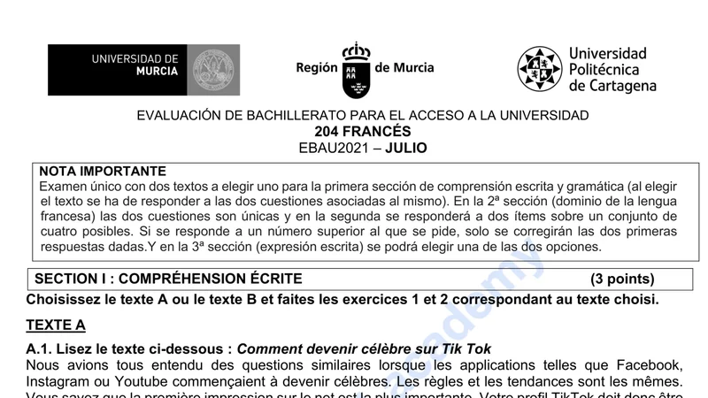 Examen PAU Francés selectividad Murcia — Ordinaria 2021